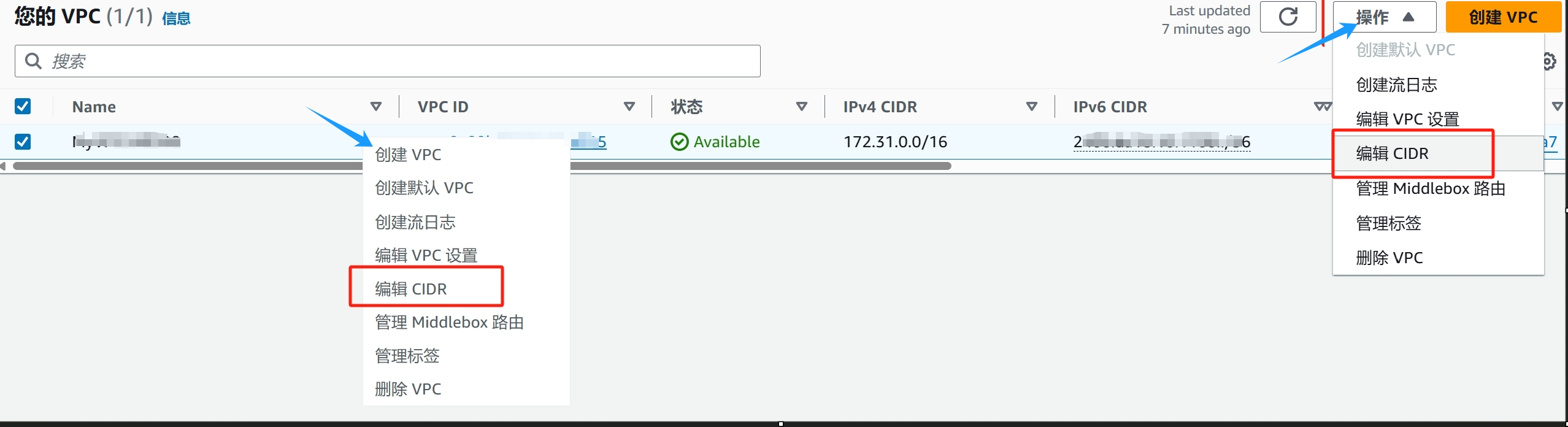 6、点击右上角【操作】菜单或者【鼠标右键】击点列表中的VPC,选择【编辑CIDR】