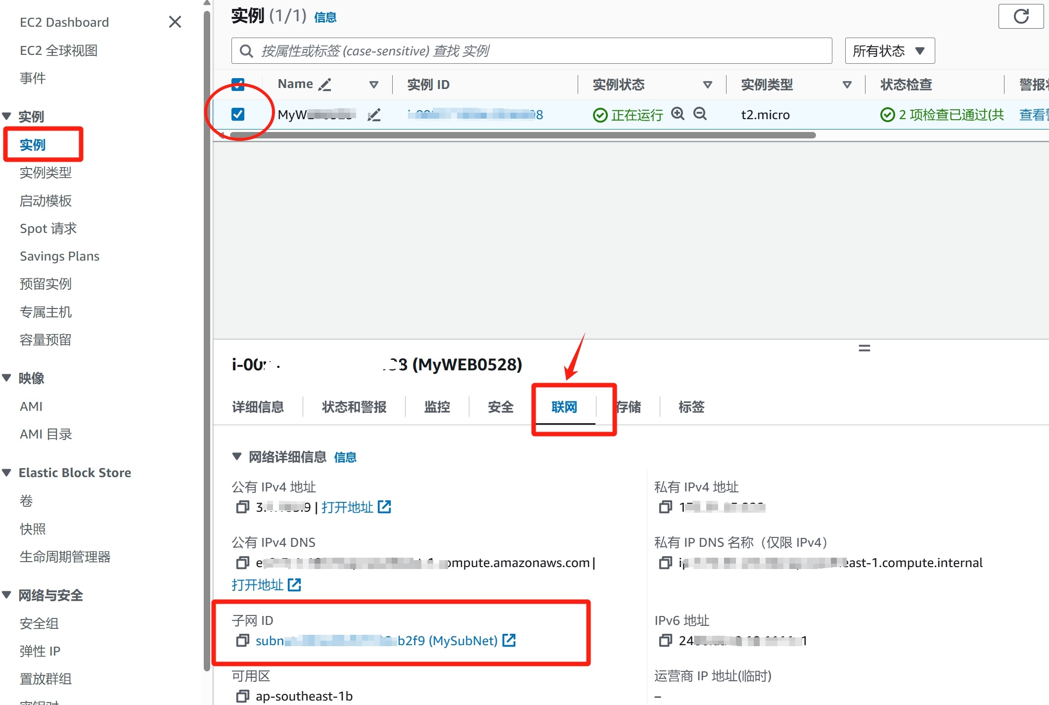 3、选中右边你刚刚EC2用的子网段,如果不确定可以在【实例】菜单查询