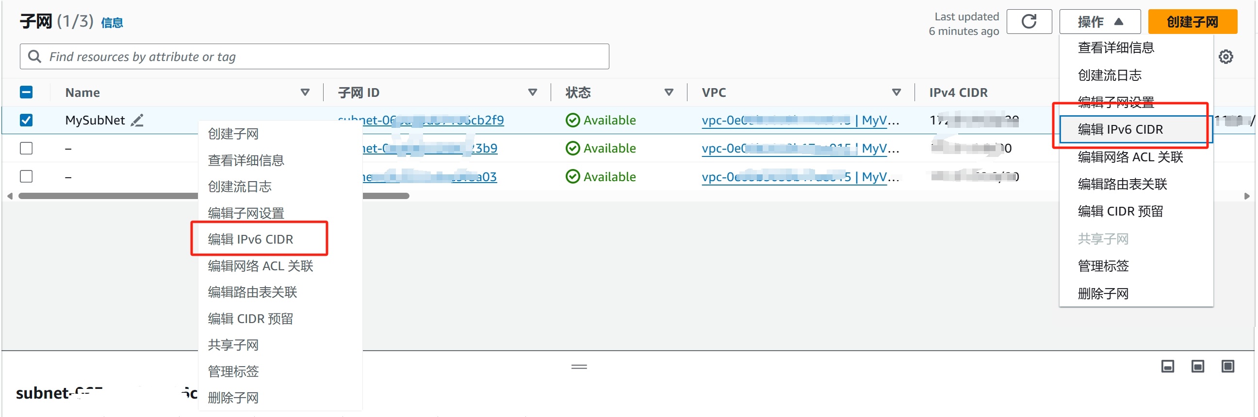 4、选择相应的子网,点击右上角【操作】菜单或者【鼠标右键】击点列表中的子网,选择【编辑IPv6 CIDR】