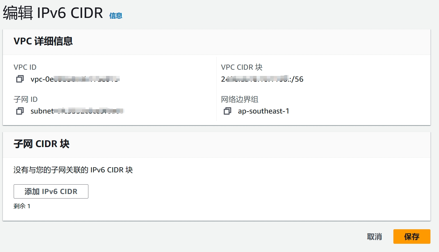 5、点击【添加 IPv6 CIDR】按钮,【VPC CIDR 块】和【子网 CIDR 块】会默认填充,也可以根据实际进行调整