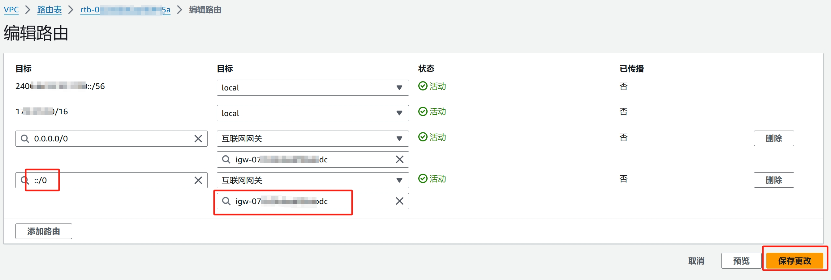 8、点左下角【添加路由】CIDR填:::/0,目标填跟0.0.0.0/0这个的目标一样的