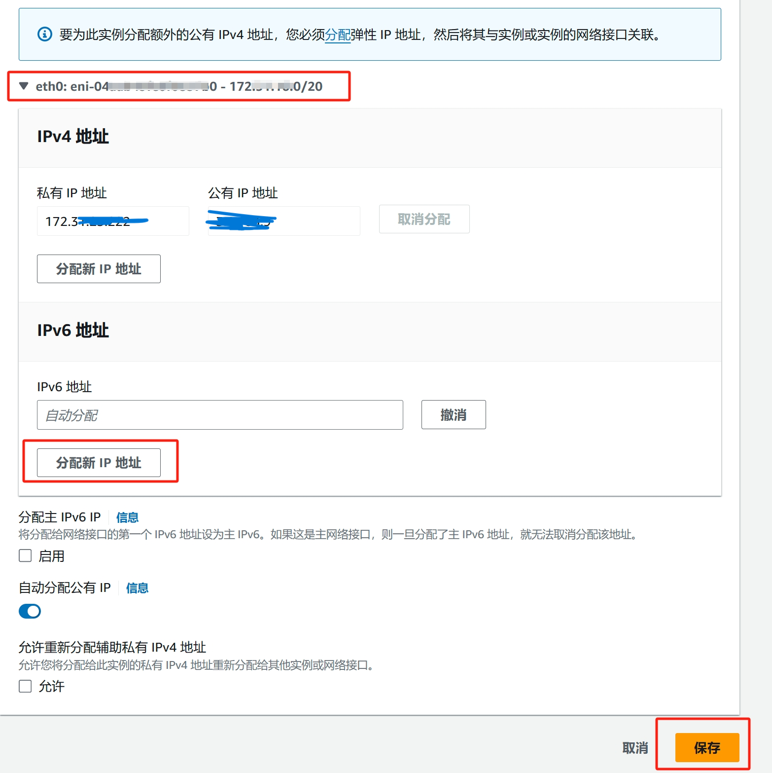 返回EC2管理界面,点击左边的【实例】菜单进入实例列表,选中你的实例,点击右上角【操作】菜单或者【鼠标右键】击点列表中你刚创建的实例,选择【联网】-->【管理 IP 地址】,点击实例的网卡【eth0: eni-0***************** - 172.**.**.0/20】显示IP配置界面,在【IPv6地址】区块,点击【分配新 IP 地址】,在IPv6地址输入框可以根据实际录入你想要的地址,也可以留空系统自动分配一个,然后点击【保存】。在弹出的【IP地址更新】确认即可。