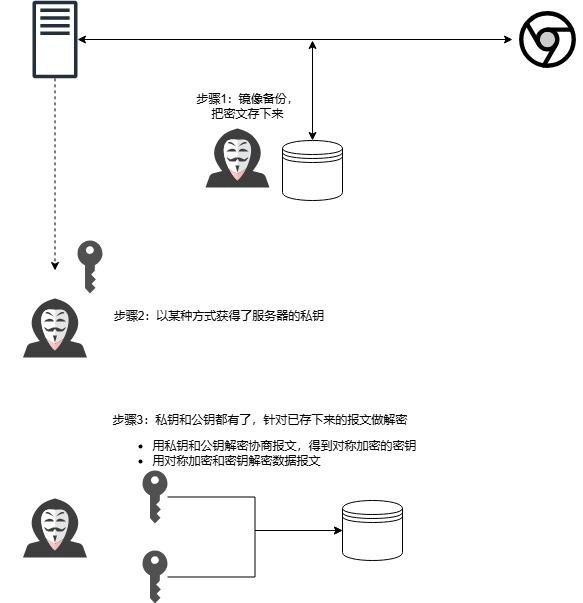 • 如果服务器私钥被泄露,历史上所有用该私钥加密过的会话密钥都可以被解密。