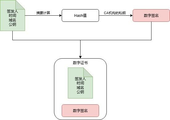 WEB服务的供应商去CA机构处登记,把自己的公钥、名字、域名等信息报上去,CA机构拿到这些信息,计算一个Hash值,然后再用CA机构的私钥把Hash值加密,加密后的结果就是数字签名。