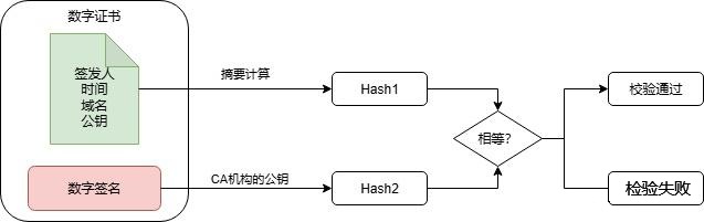 浏览器在拿到证书后,把证书里面的信息也计算一遍Hash。再用CA机构的公钥把证书里的数字签名进行解密,得到CA机构计算的Hash,两个一对比,就知道这证书是不是公证人签发的,以及有没有被篡改过了。
