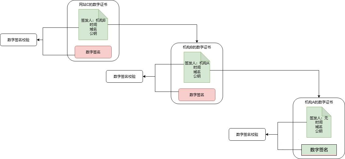证书之间的认证也不止一层,可以A信任B,B信任C,以此类推,这就是信任链。也就是一连串的数字证书,由根证书为起点,透过层层信任,使终端实体证书的持有者可以获得转授的信任,以证明身份。