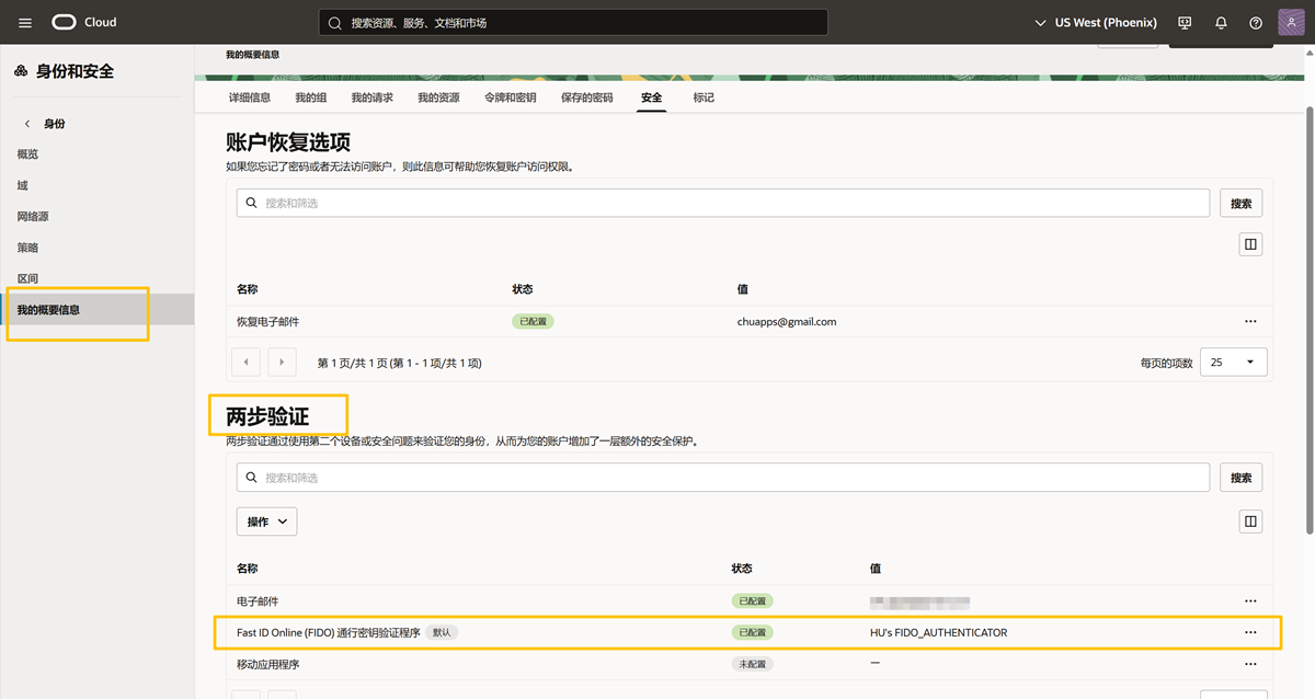 当您的甲骨文云两步验证MFA丢失或更换终端后,可以通过绕过码实现重置MFA。 如何设置绕过码,请参考《甲骨文云如何生成绕过码》。 当更换终端后,在登录时选择绕过码登录,成功登录甲骨文云控制台后,点击右上角【个人图标】,进入【用户设置】,点击左侧菜单【我的概要信息】,选择【安全】选项卡,在【两步验证】选项卡处,将【Fast ID Online (FIDO) 通行密钥验证程序】通过后面的【...】删除即可,然后注销当前登录重新登录,系统会要求通过邮件收取一个验证码即可重建MFA。