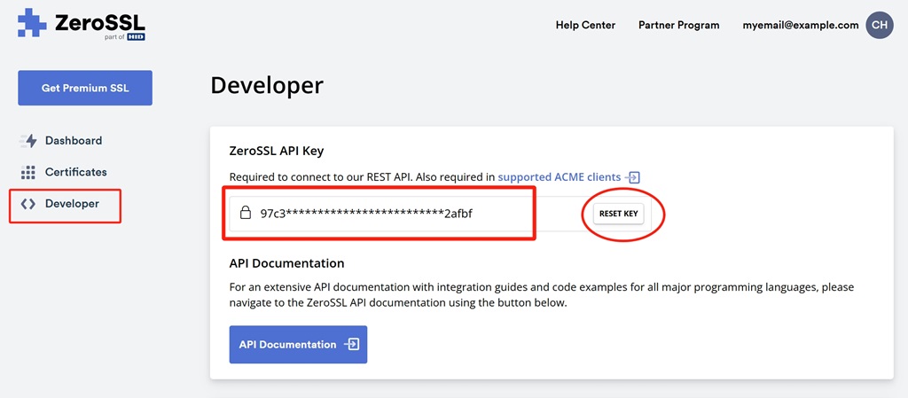 首先请登录ZeroSSL官网(没有账号就先注册一个,注册很简单,输入邮箱地址和密码即可)进入后台控制面板,点击左侧的【Developer】菜单,即可看到你当前账号的ZeroSSL API Key,也可以点击【RESET KEY】按钮重新生产一个ZeroSSL API Key,执行如下命令通过 API Key 获取 eab-kid 和 eab-hmac-key。