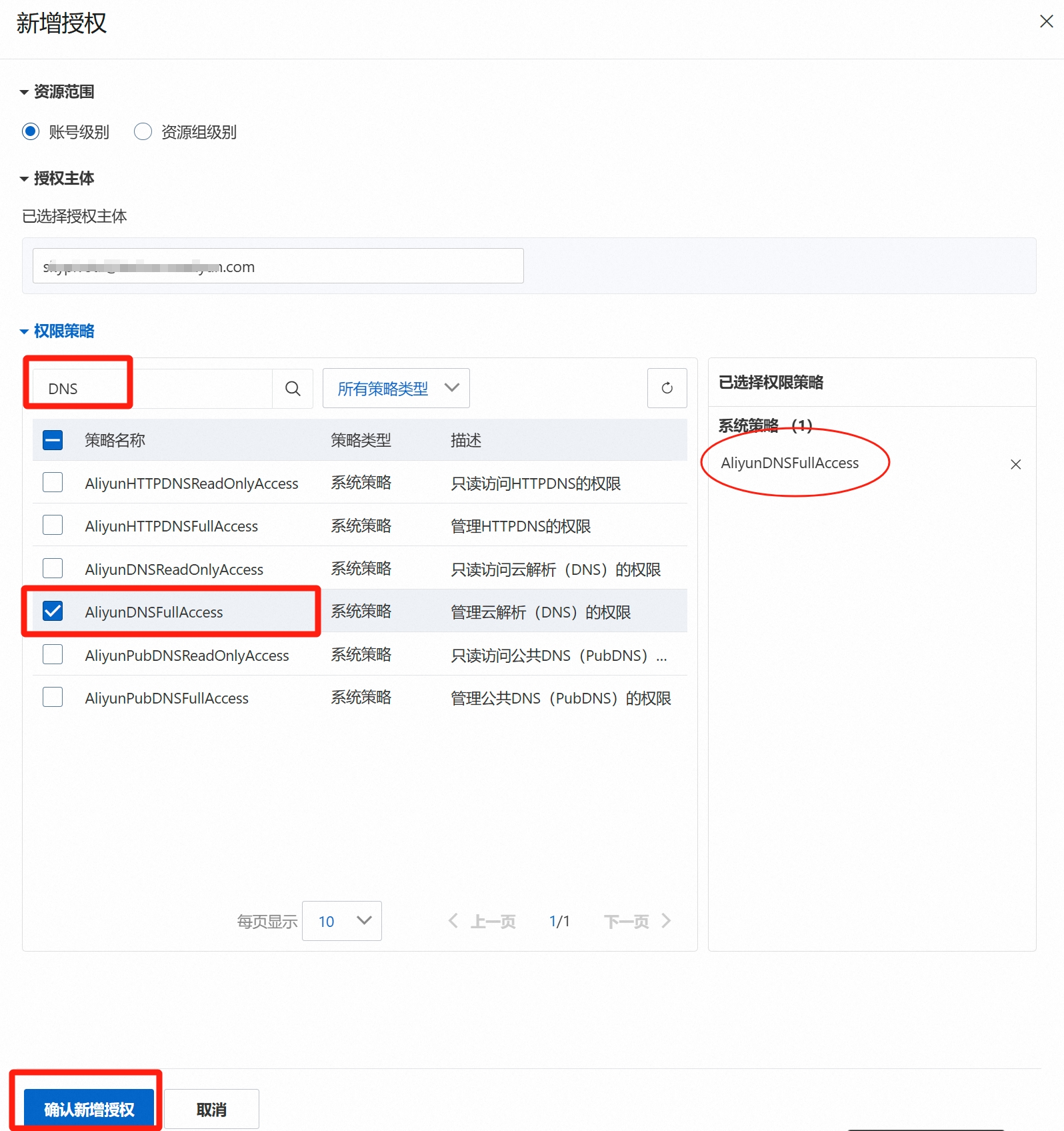 复制保存好生成的AccessKey信息(AccessKey ID、AccessKey Secret),返回用户列表,点击刚创建的用户,进入【权限管理】--【新增授权】,搜索DNS,勾选策略名称为“AliyunDNSFullAccess”(描述为:管理云解析(DNS)的权限)的策略,确认新增授权。