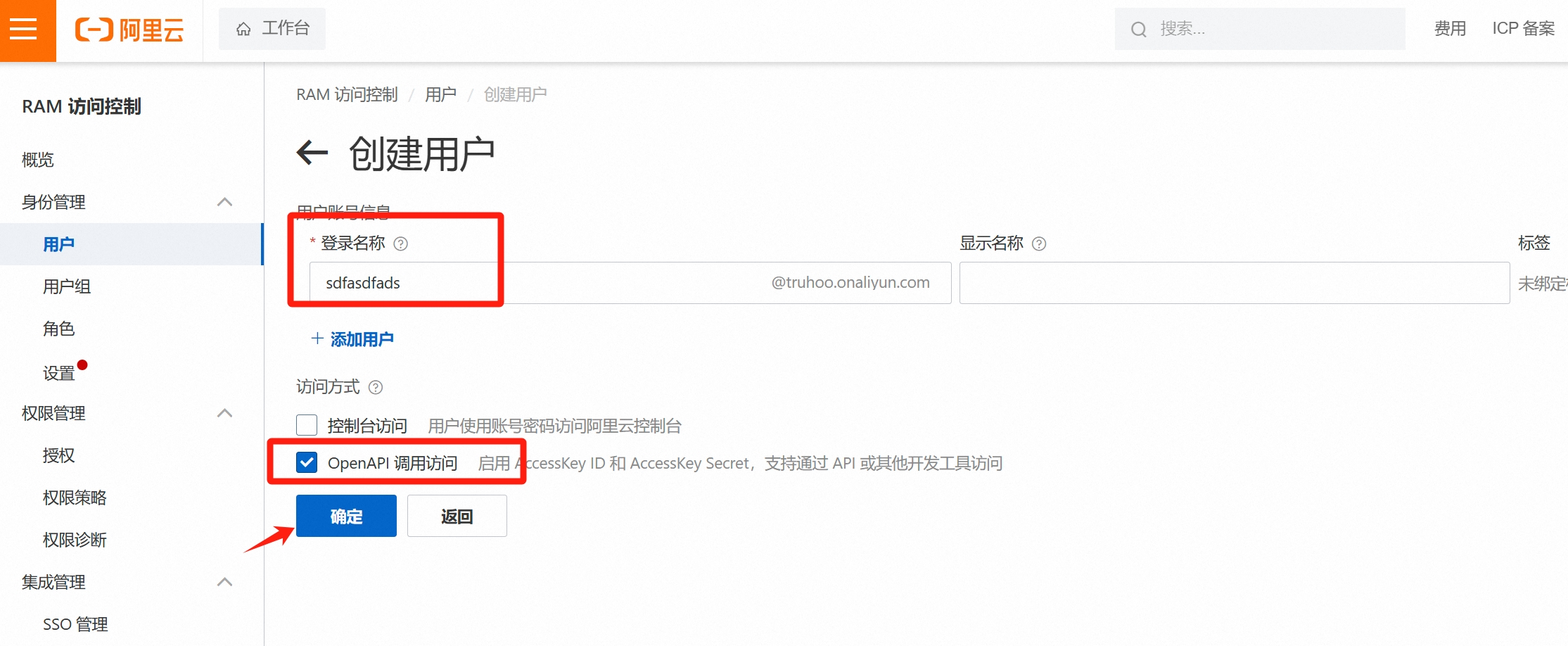 登陆阿里云控制台 - 访问控制 RAM - 身份管理-用户-创建一个新用户-输入登录名称,勾选访问方式为“OpenAPI 调用访问”,确定创建。